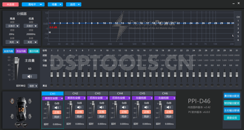 此软件是PPIPrecisionPower D46的专用电脑DSP调音软件,支持PPI型号为D46的DSP设备调音。 声明:本站所有文章,如无特殊说明或标注,均为本站原创发布。任何个人或组织,在未征得本站同意时,禁止复制、盗用、采集、发布本站内容到任何网站、书籍等各类媒体平台。如若本站内容侵犯了原著者的合法权益,可联系我们进行处理。